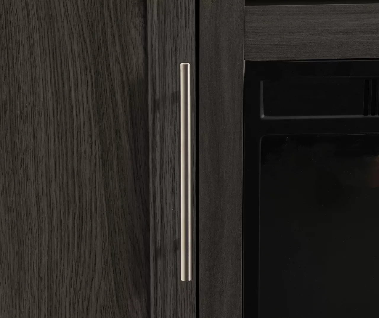 - Woodgrain-like cabinet in a gray finish